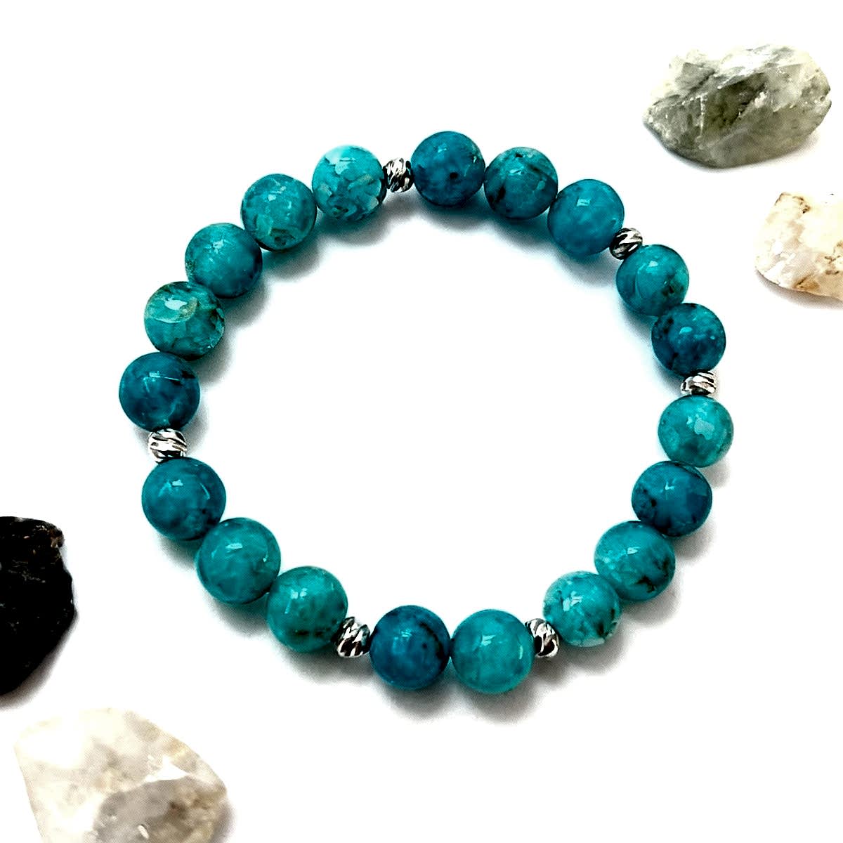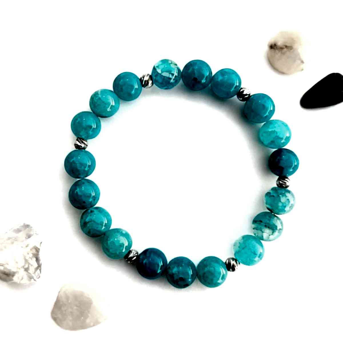 Bu zarif mavi akik bileklik, 8 mm boyutundaki özenle seçilmiş doğal mavi akik taşlarından el emeğiyle üretilmiştir. Turkuaz ve açık mavi tonlarındaki sakinleştirici renkleriyle göz alıcı akik taşları, gümüş renkli metal ara parçalarla birleştirilerek hem modern hem de zamansız bir tasarım oluşturulmuştur.