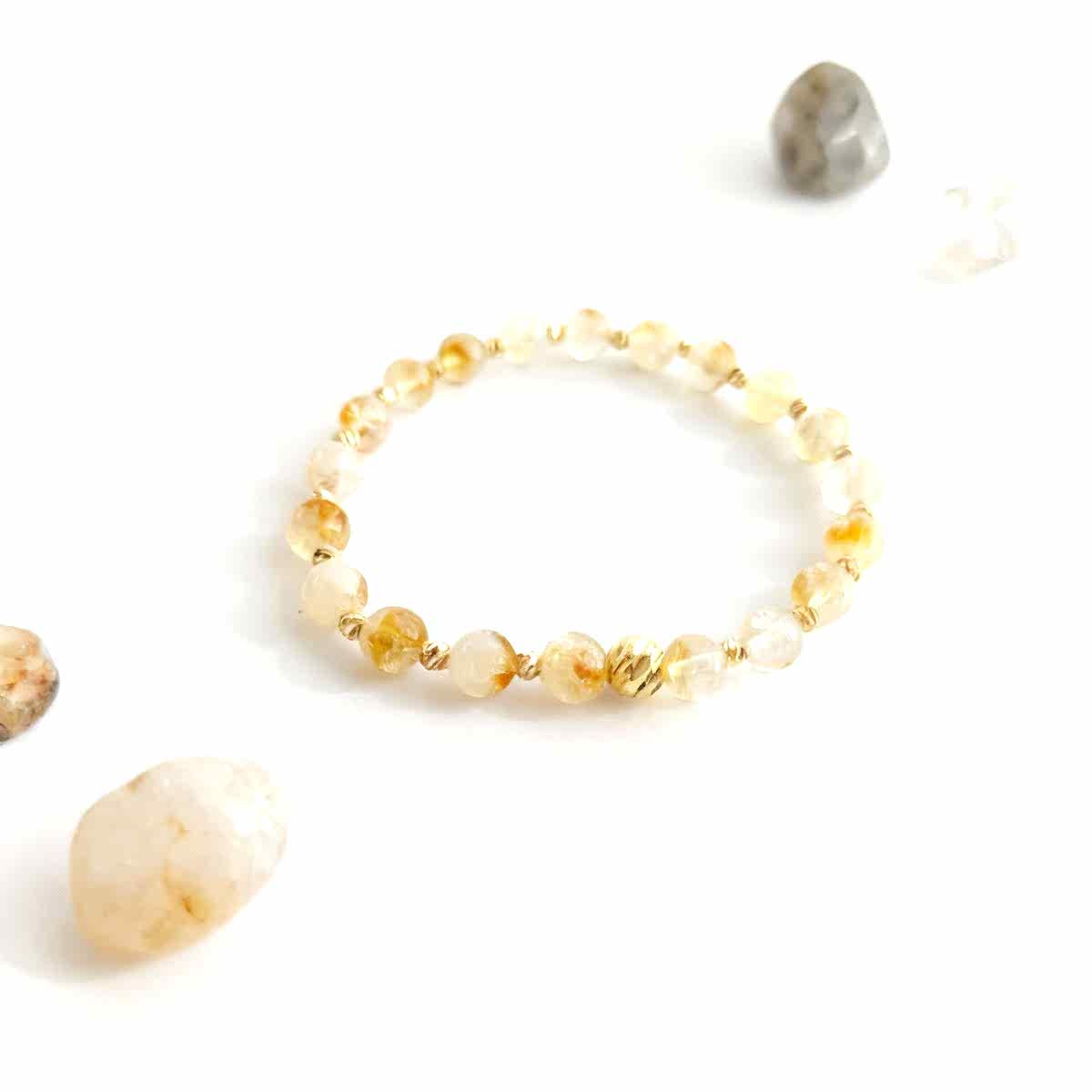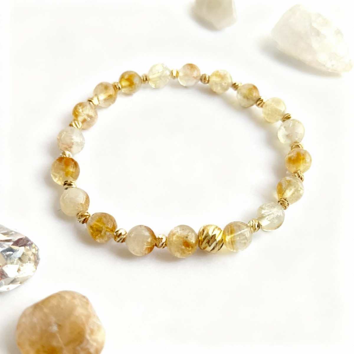 Bu ışıltılı sitrin bileklik, 6 mm boyutundaki özenle seçilmiş doğal sitrin taşlarından el emeğiyle üretilmiştir. Bal sarısı ve altın tonlarındaki berrak sitrin taşları, altın renkli metal ara parçalarla birleştirilerek hem zarif hem de enerjik bir tasarım oluşturulmuştur.