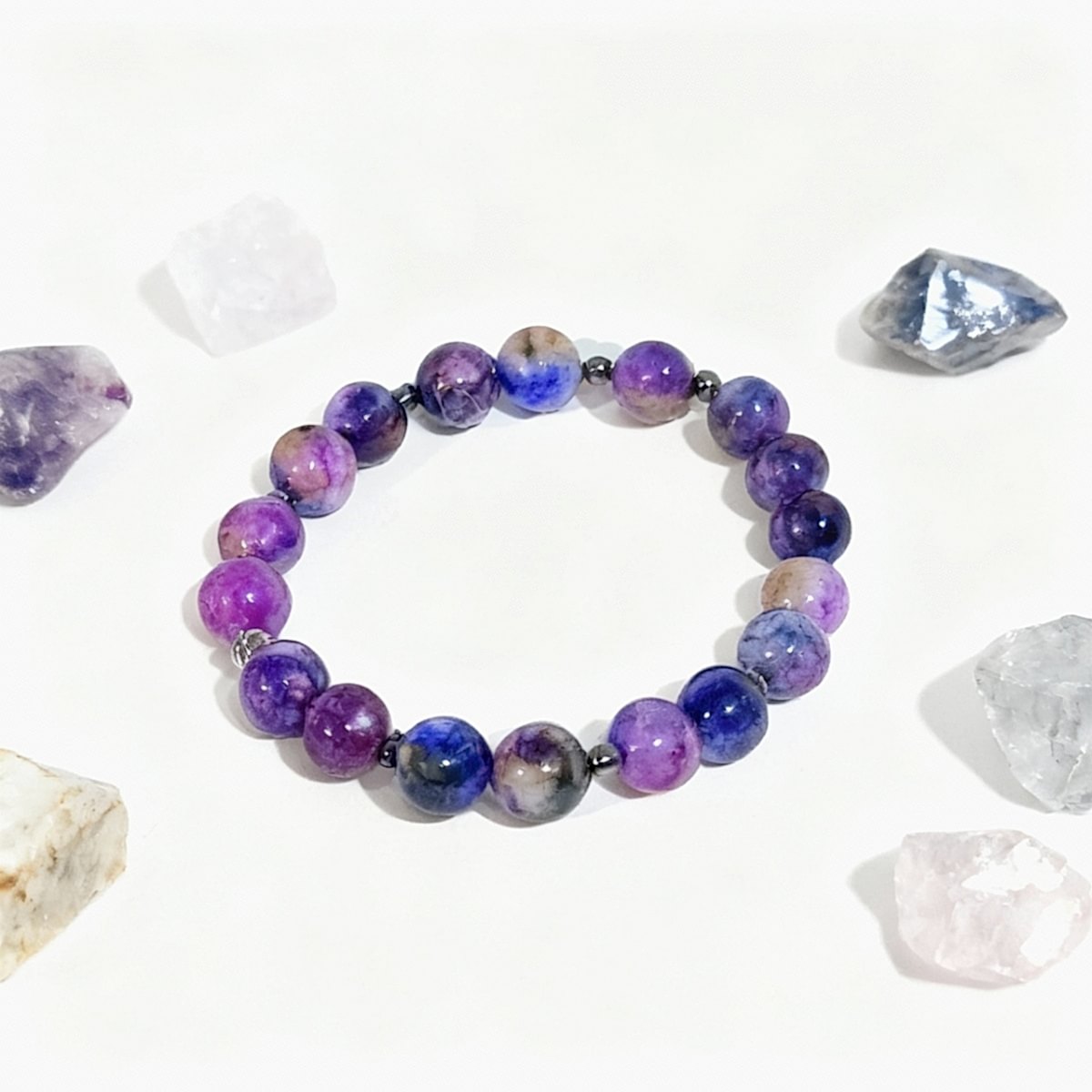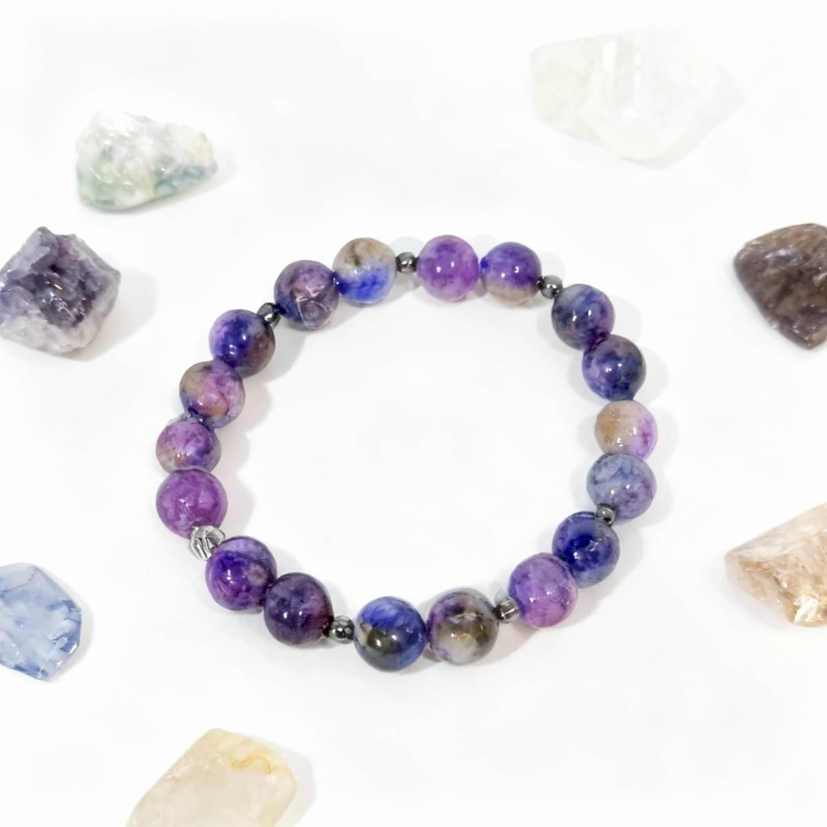 Mor ve lila tonlarıyla dikkat çeken bu el yapımı bileklik, nadir bulunan sugilit taşı ile tasarlanmıştır. Her biri doğal ve eşsiz taşlardan oluşan bu özel bileklik, sadece tek adet üretilmiştir.